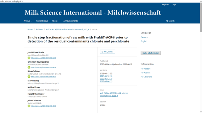 Seit unsere Arbeit „Single step fractionation of raw milk with FraMiTrACR® prior to detection of the residual contaminants chlorate and perchlorate“ 2023 im wissenschaftlichen Journal Milk Science International veröffentlicht wurde, hat sich die FraMiTrACR®-Technologie zunehmend als praktische Probenvorbereitung in der Spurenanalytik etabliert. Das Verfahren ermöglicht die gezielte Fraktionierung von Rohmilch in einem einzigen Schritt und schafft damit eine zuverlässige Grundlage unter anderem für den Nachweis von Rückständen wie Chlorat und Perchlorat.